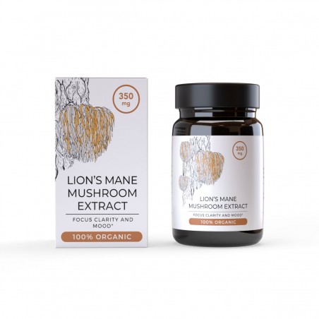 Capsule premium cu extract organic de Lion’s Mane, 350 mg per capsulă, într-o formulă vegană orientată spre focus și claritate mentală.